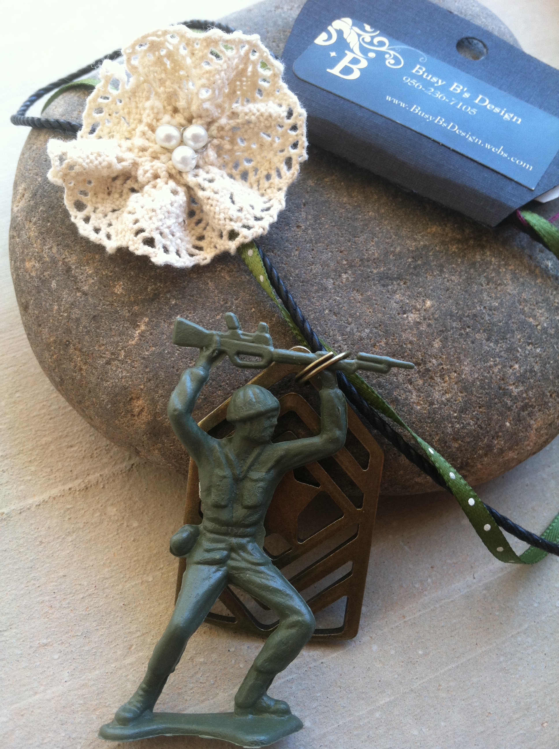 A toy army guy posed for action against a antique brass pendent reminiscent of an old army rank. Both hang from an 18inch necklace of army green ribbon and black cord. A sweet cream lace flower with a triple pearl center reminds us that every good army guy has a flower at home waiting for him.