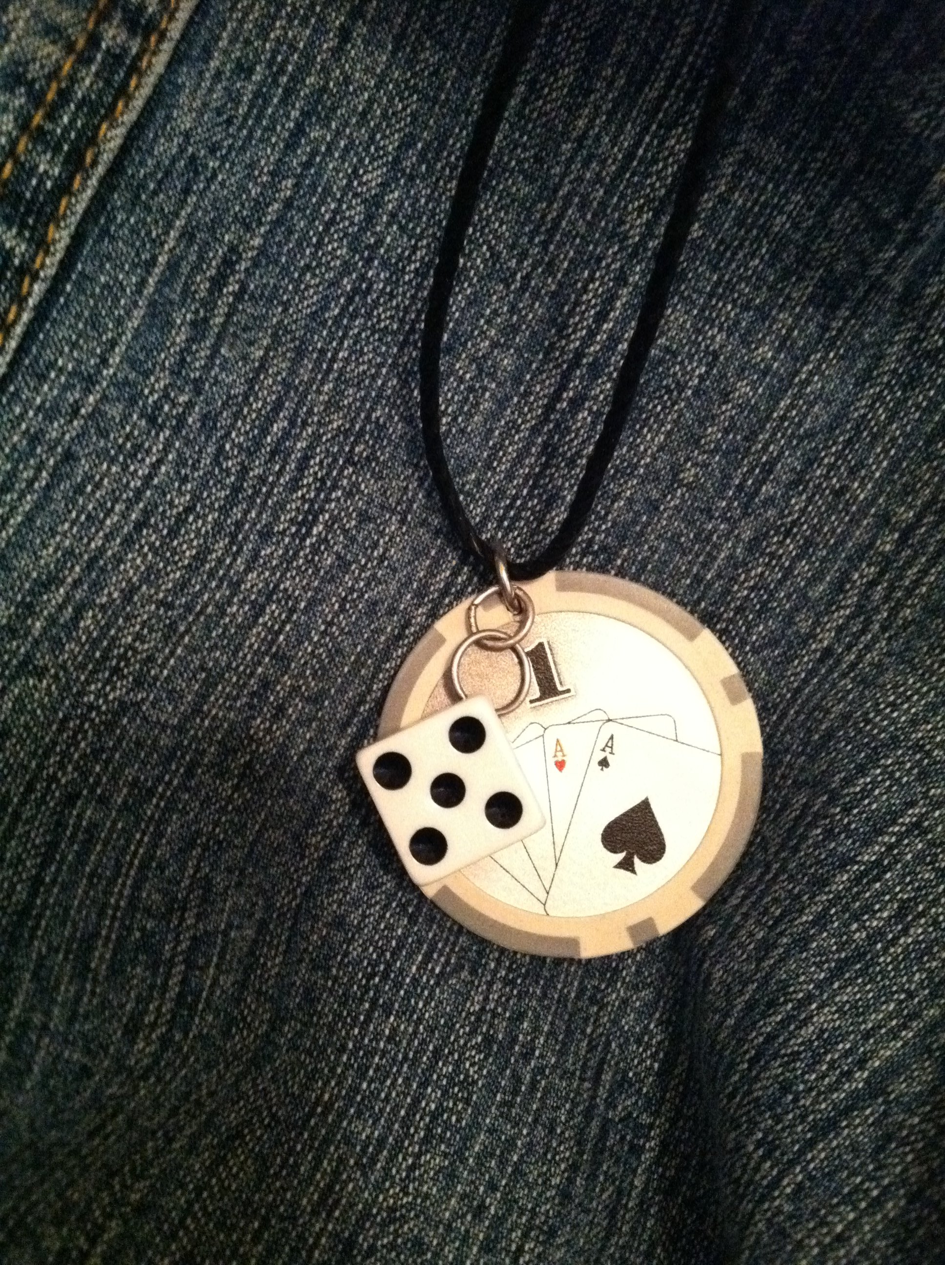 Las Vegas Poker Chip with a lucky die all hanging on an 18in black cord necklace with lobster claw clasp. Available in all five colors. Each chip has the famous Welcome to Las Vegas sign and a poker hand on the opposite side. Choose your favorite!