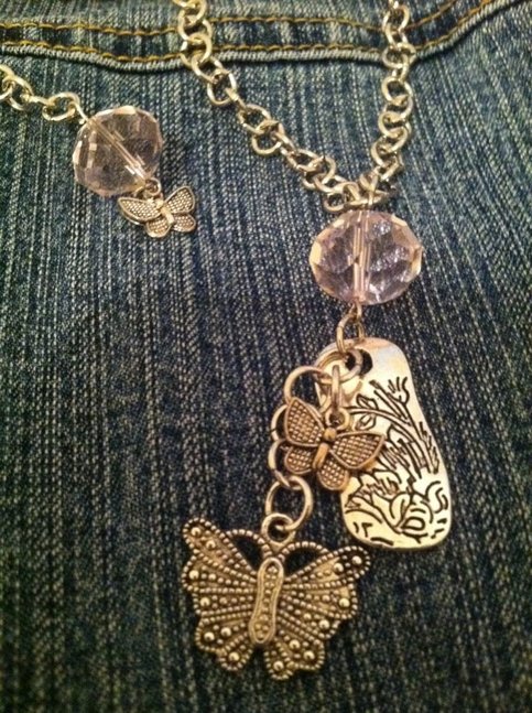 A silver chain holds a large pink crystal with butterflies and a long tag charm with Journey written on the back. This necklace has a surprise smaller pink crystal and small butterfly that hang down in the back for an added sparkle.