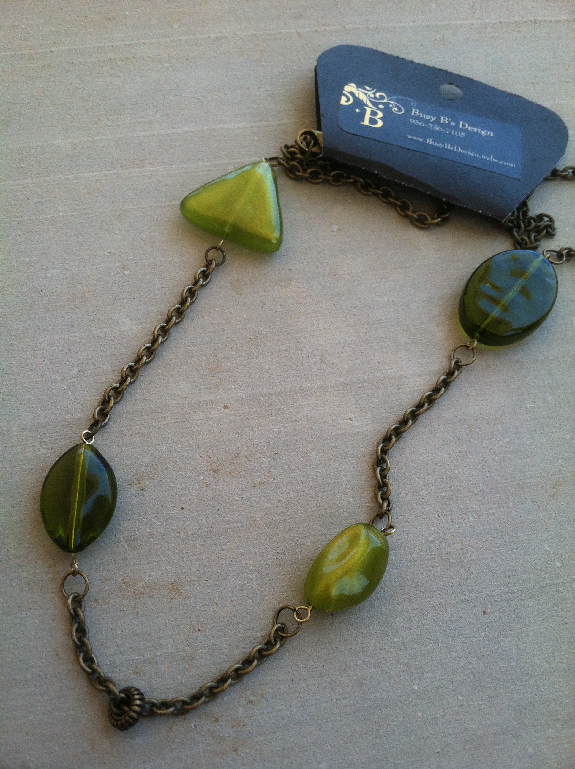 Green acrylic beads and one antique brass ring float on this antique brass finished chain.
