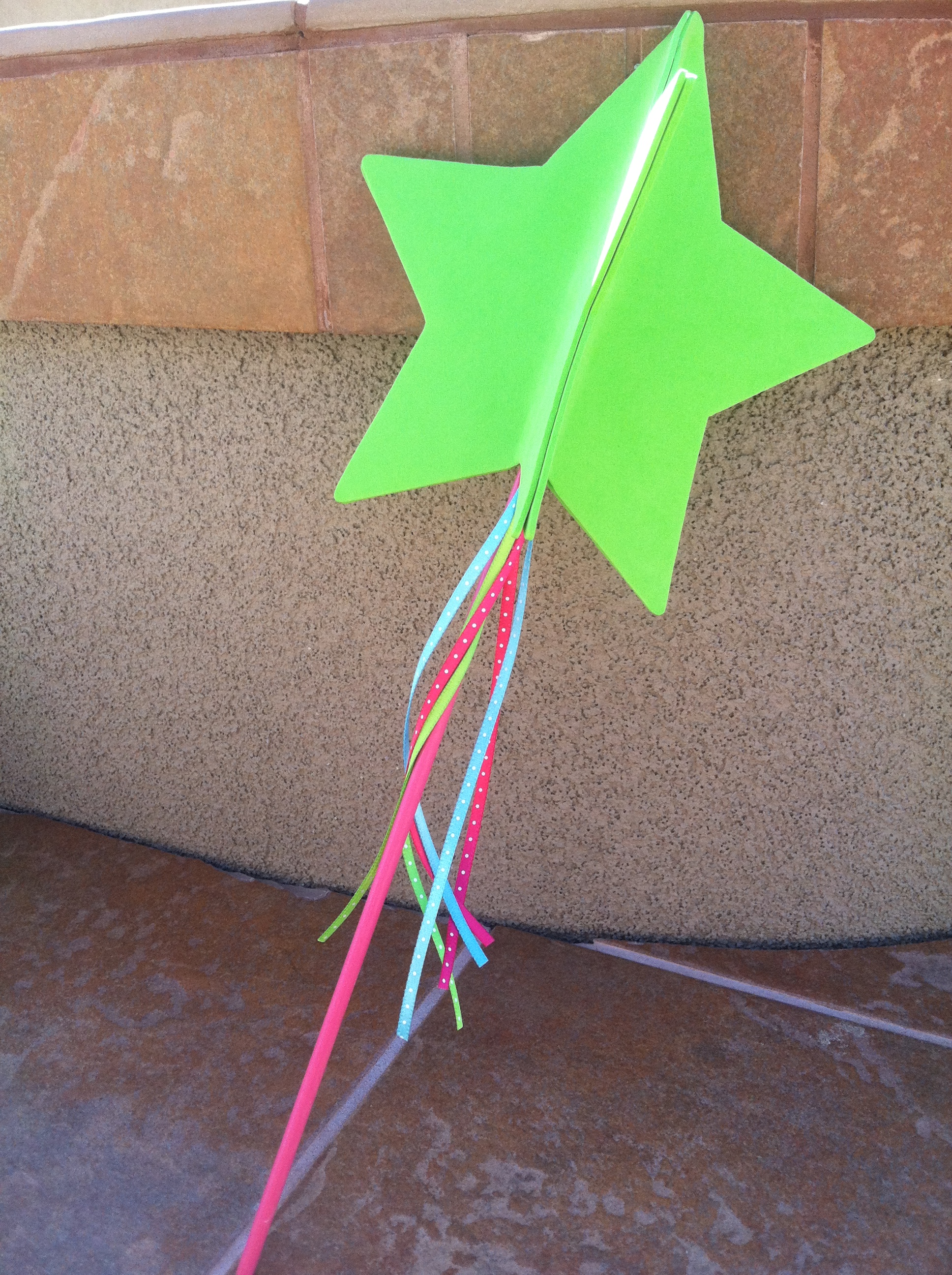 This star wand is made of 3 durable foam stars and flowing ribbons. Great for the fairy, princess, or wizard in the family.