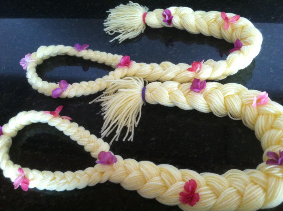 What little girl doesn't want to dress up like Repenzel from Tangled? This braid is made with yellow yarn and adorned with pink and purple flowers. Due to the stretchy natural of the yarn the braid fits children and adults. Repenzel's Braid is worn around the top of the head like a halo and then trails into a braid 2.5 feet long and over 2 inches wide.